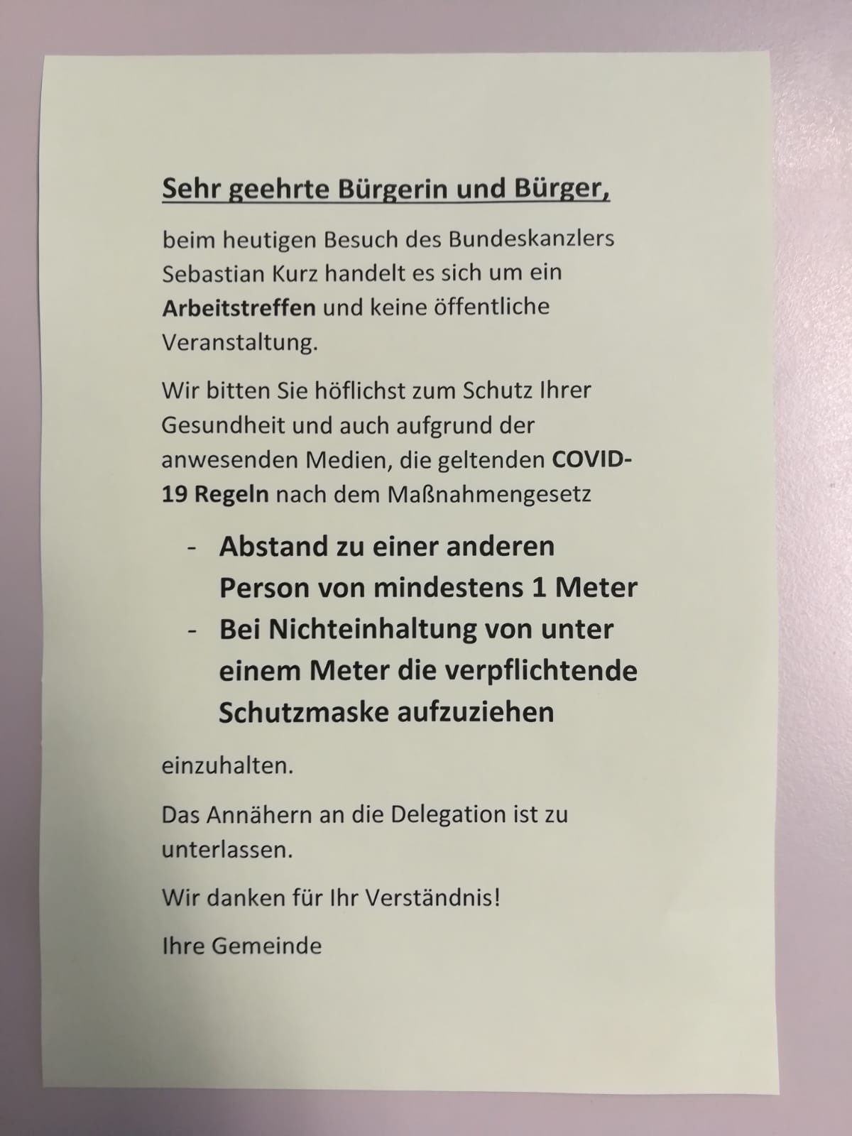 Jetzt mal Hand aufs Herz. Ein Bundeskanzler samt Delegation fährt ins Walsertal zu einem „Arbeitstreffen“. Es wird in der Gemeinde öffentlich kommuniziert, ja sogar zur Beflaggung und zum Winken aufgerufen. Zur Sicherheit erzählt man freilich, dass man sich der Delegation nicht nähern darf. Und später beteuert man auch, dass die Bundespartei damit gar nix zu tun habe, die Walsertaler winken und beflaggen halt so gern. Und dann spaziert die Delegation durch die Straßen - nur zum Zurückwinken natürlich.