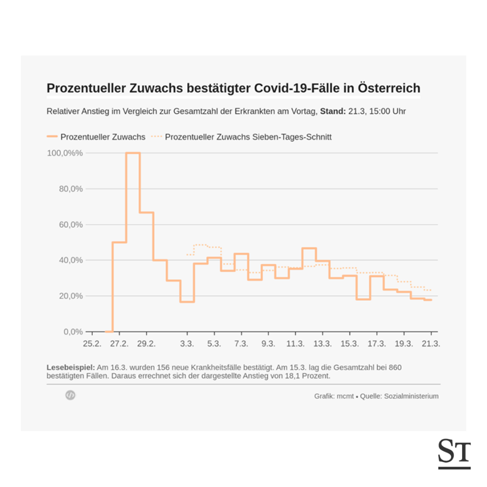 Zahlen: Aktueller Stand (21.03.2020, 15:00 Uhr): 2.814 Fälle; Nach Bundesländern: Burgenland (53), Kärnten (78), Niederösterreich (394), Oberösterreich (535), Salzburg (184), Steiermark (379), Tirol (575), Vorarlberg (228), Wien (359); 18.545 Testungen, Genesene Personen: 9, Todesfälle: 15