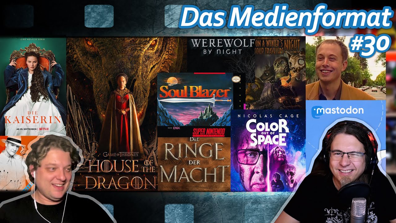 0:00:00 - Willkommen zu Das Medienformat #30! 0:07:02 - Medienmacher Update Florian 0:13:07 - Medienmacher Update humaldo 0:21:25 - DISKUSSION // Elon VS Twitter 0:42:24 - Mastodon - Mehr als nur ein Twitter-Klon! 1:05:13 - GAMES // Soul Blazer (SNES) 1:15:58 - Scorn (Xbox SX) 1:22:22 - Persona 5 Royal (Steam Deck) 1:29:00 - If on a Winter’s Night, Four Travelers (Steam) 1:34:52 - The Dark Prophecy (Switch) 1:39:00 - Resident Evil 8 DLZ - Shadows of Rose 1:46:33 - MEDIEN // Worüber wir diesmal nicht reden 1:57:37 - Die Kaiserin (Netflix) 2:07:48 - Werewolf by Night (Disney Plus) 2:12:25 - Color out of Space (Prime) 2:18:54 - Black Panther - Wakanda Forever (Kino) 2:29:02 - Midnight Club (Netflix) 2:33:56 - The Watcher (Netflix) 2:45:24 - Nine (Bühne Baden) 2:50:28 - The Playlist (Netflix) 2:56:36 - Ringe der Macht (Amazon Prime) 3:17:33 - The House of the Dragon (Sky X)