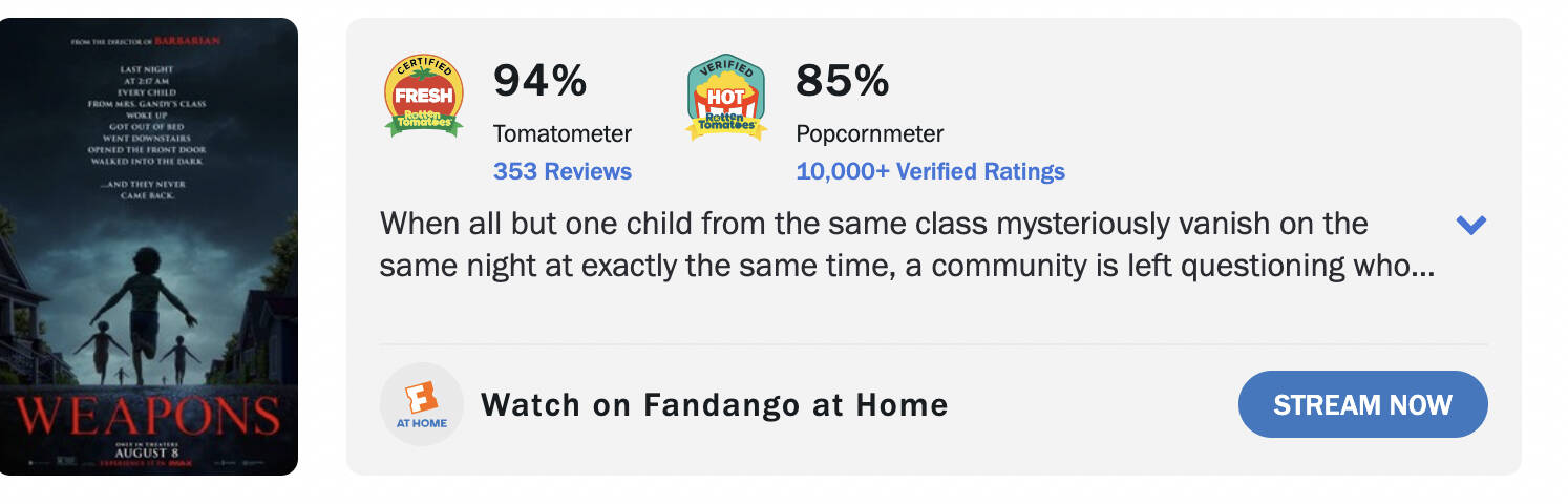 Jo, da stimme ich dir zu, gute Horrorfilme, die auch mal überraschen, gibts selten. Und gerade da sticht Weapons hervor, auch wenn die Wikipedia Zusammenfassung einen anderen Eindruck macht.