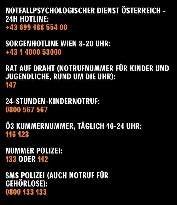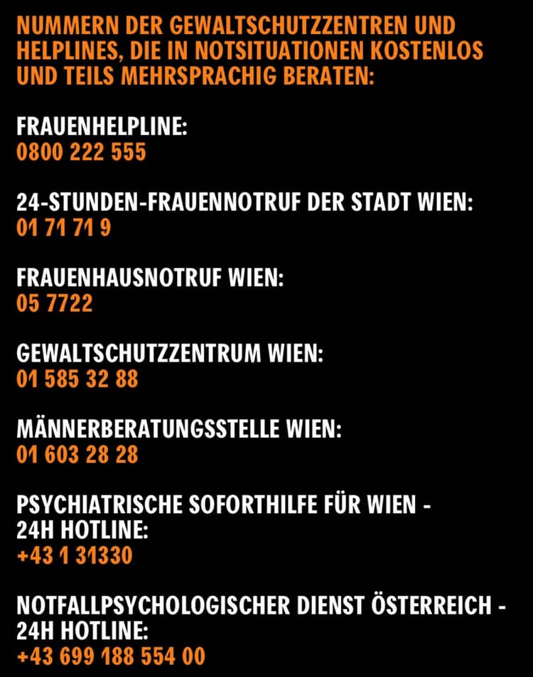 Hier auch noch ein paar wichtige Telefonnummern und Anlaufstellen, wo man sich melden kann, wenn man von Gewalt betroffen ist oder Probleme damit hat, sich selbst zu regulieren. Bitte thematisierts das manchmal mit euren männlichen Freunden und Verwandten. Danke. https://www.gewaltinfo.at/