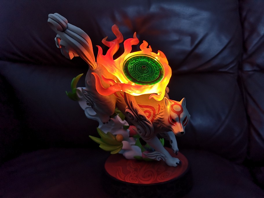 Neu bekommen: die PVC Figur von Amaterasu aus Okami. Der Flammenring oben leuchtet (entweder durchgehend oder in so einem Flacker Modus) und drunter ist natürlich auch ein Spiegel. Tolle Figur.