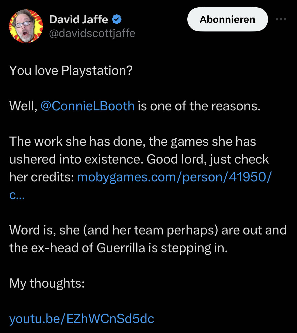 Jaffe schreibt: „Morgen werden traurige, frustrierende und möglicherweise sehr respektlose Neuigkeiten über PlayStation bekannt gegeben, wenn meine Quellen korrekt sind. Ich spreche in diesem Video nur für Mitglieder darüber. Aber in weniger als 24 Stunden bin ich sicher, dass die Journalisten es in die Finger bekommen und die Geschichte erzählen werden. Es ist nicht sicher, aber diese 2 Quellen (beide arbeiten bei Playstation) haben sich noch nie geirrt mit dem, was sie mir mitteilen.“