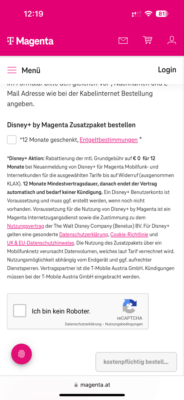 Aktion: Rabattierung der monatlichen Grundgebühr auf € 0,- für die ersten 12 Monate bei Neuanmeldung von Disney+ für Magenta Mobilfunk- und Internetkunden für die ausgewählten Tarife bis auf Widerruf, danach € 8,99 monatlich. 24 Monate Mindestvertragsdauer.