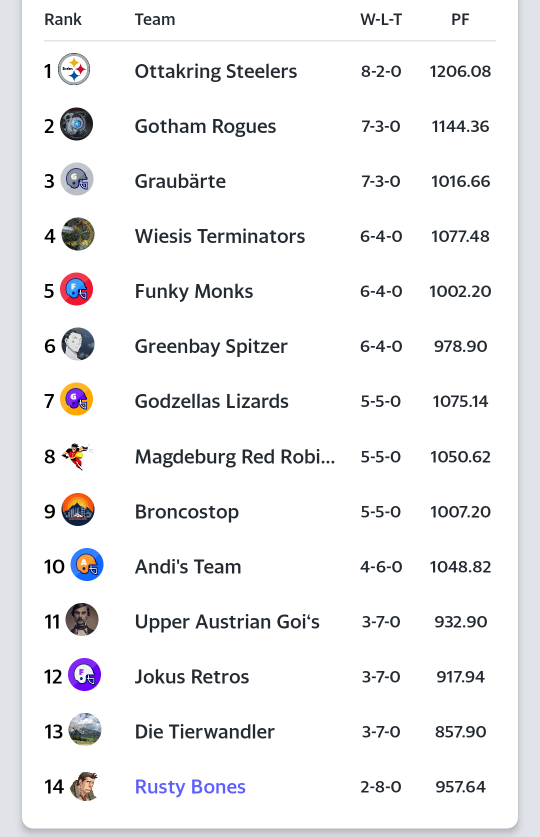 Die Steelers aus Ottakring stehen nicht zu unrecht mit 8 Siegen alleine an der Spitze. Deren Manager ist es gelungen ein Team ohne echte Schwachstellen zu zimmern, das wirklich jede Runde verlässlich abliefert. Da nur noch 5 Runden zu spielen sind und nächste Woche mein arg gebeuteltes Team als Gegner aufläuft, kann man fast fix davon ausgehen, dass sich die Steelers für das PlayOff qualifizieren.